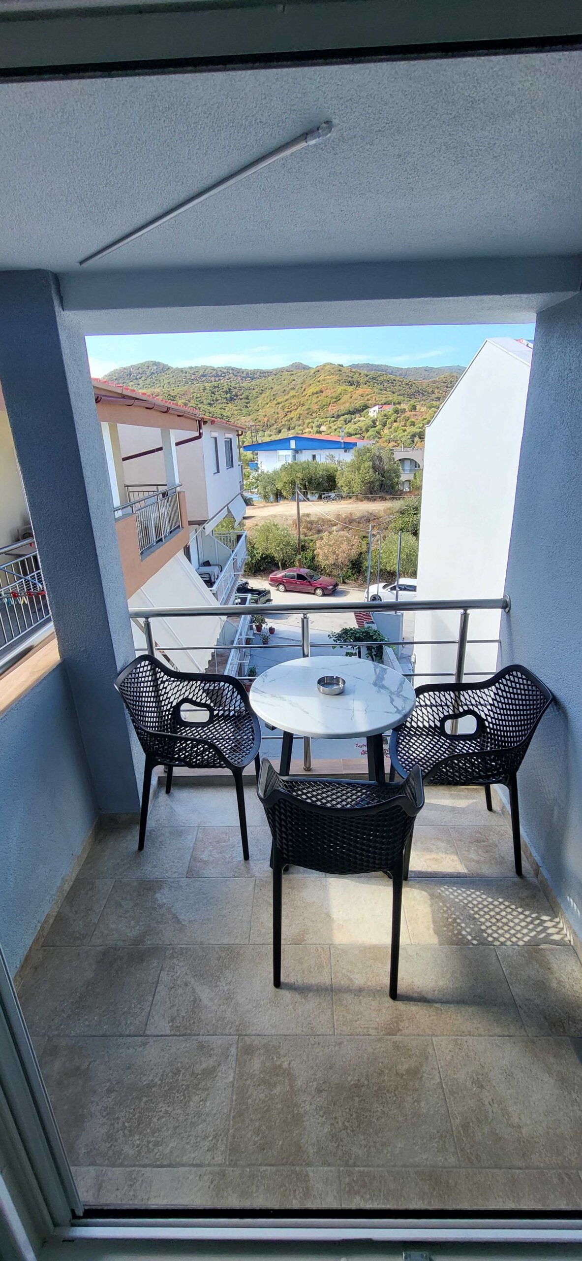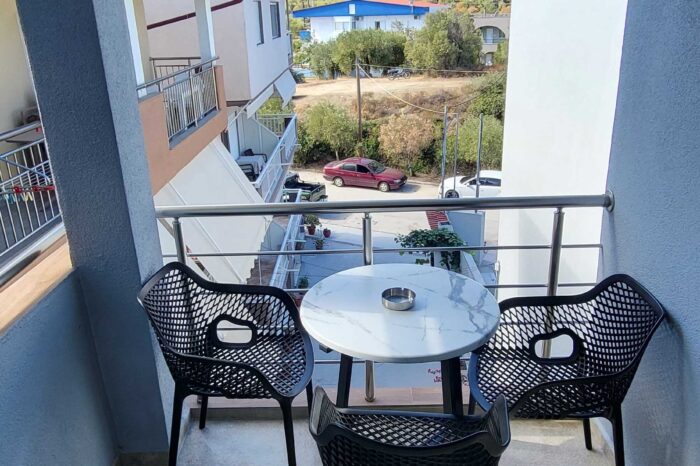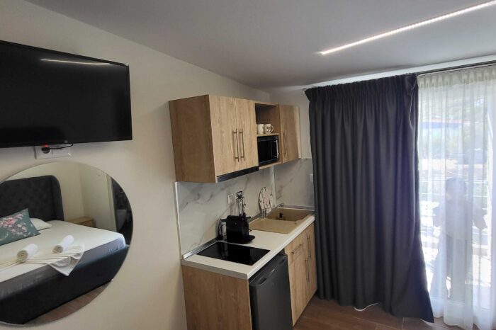 Η πλήρως εξοπλισμένη κουζίνα περιλαμβάνει ψυγείο, φούρνο και όλα τα απαραίτητα σκεύη, επιτρέποντάς σας να προετοιμάσετε γεύματα με άνεση, σαν στο σπίτι σας. Το μπάνιο είναι προσεγμένο, με ντους και είδη προσωπικής υγιεινής, προσφέροντας μια πρακτική και ευχάριστη εμπειρία. Το μπαλκόνι, με θέα στο βουνό, αποτελεί το ιδανικό σημείο για να απολαύσετε τον πρωινό σας καφέ ή να χαλαρώσετε το απόγευμα, σε ένα γαλήνιο περιβάλλον.