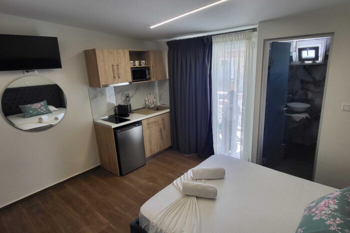 Το deluxe studio βρίσκεται στον τρίτο όροφο και προσφέρει έναν μοναδικό συνδυασμό άνεσης και λειτουργικότητας, ιδανικό για μια ξεκούραστη και ευχάριστη διαμονή. Ένας ευρύχωρος ενιαίος χώρος κατάλληλος για οικογένειες, ζευγάρια ή παρέες φίλων. Το studio διαθέτει ένα άνετο διπλό κρεβάτι και ένα μονό κρεβάτι, κλιματισμό (A/C) και δορυφορική τηλεόραση.