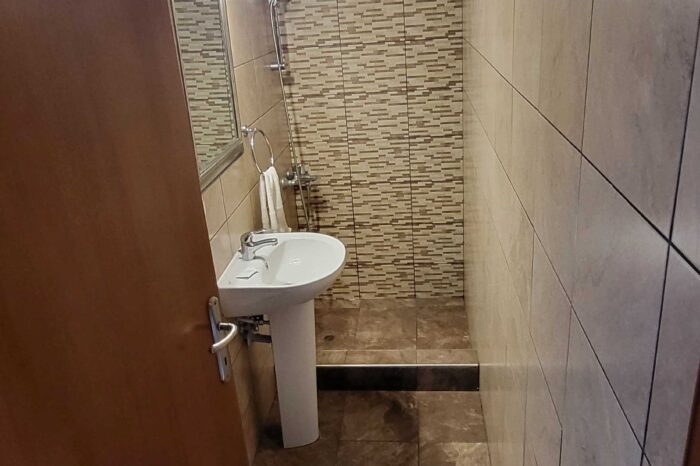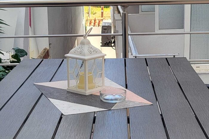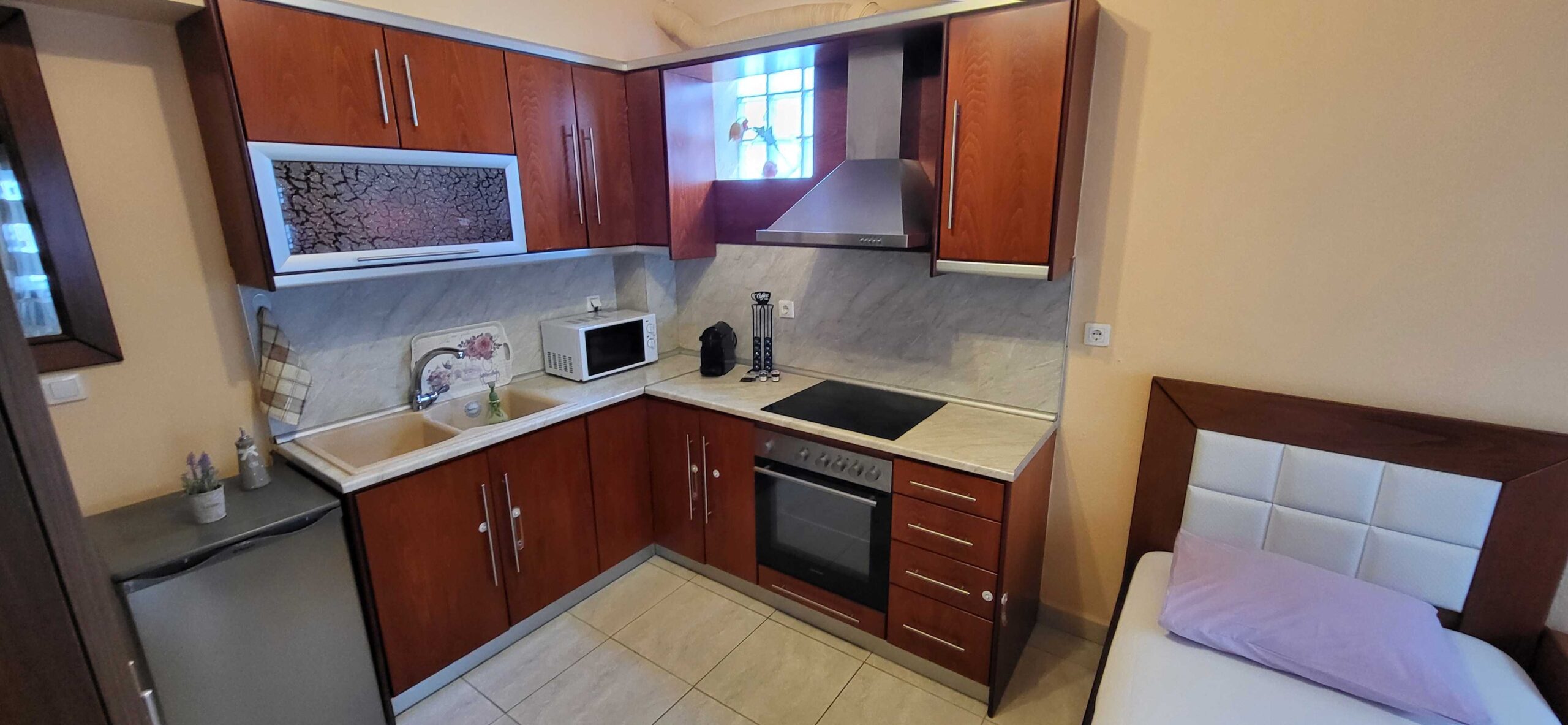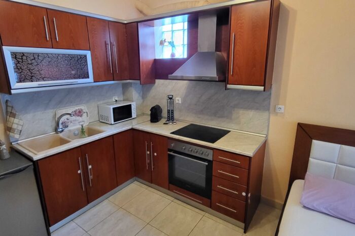 Η πλήρως εξοπλισμένη κουζίνα περιλαμβάνει ψυγείο, φούρνο και όλα τα απαραίτητα σκεύη, επιτρέποντάς σας να προετοιμάσετε γεύματα με άνεση, σαν στο σπίτι σας. Το μπάνιο είναι προσεγμένο, με ντους και είδη προσωπικής υγιεινής, προσφέροντας μια πρακτική και ευχάριστη εμπειρία. Το μπαλκόνι, με μερική θέα στη θάλασσα και το βουνό, αποτελεί το ιδανικό σημείο για να απολαύσετε τον πρωινό σας καφέ ή να χαλαρώσετε το απόγευμα, σε ένα γαλήνιο περιβάλλον.